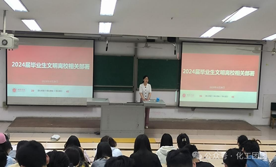 分团委书记兼毕业班辅导员陈佳对毕业生文明离校工作进行布署,加强对毕业生的思想教育,引导学生积极配合学校毕业离校工作,充分发挥学生党员、学生干部等骨干力量的先锋模范作用,保障毕业生安全文明离校。
