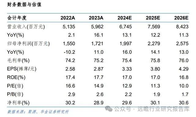 根据最新财报和行业环境变化,我们预计公司24-26年公司营收同比分别增12.1%、10.3%、9.1%,归母净利同比分别增12.5%、11.0%、9.8%,EPS分别为8.76、9.72、10.67元/股,对应PE分别为17.7X、15.9X、14.5X。