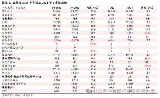 公司23年毛利率88.30%,同比+1.71pct;24Q1公司毛利率88.37%,同比+0.28pct;公司23年/24Q1销售/管理/研发费用率分别为13.15%/3.77%/0.75%及7.85%/2.49%/0.33%,同比分别-0.58/-0.86/-0.07pct及-1.23/-0.79/+0pct;23/24Q1净利率同比+2.52/+0.92pct至43.95%/49.83%。