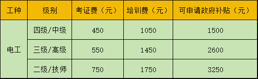 先预交考证费:中级:450元、高级550元,技师:750元,(学员免费培训,考取证书后补交培训费,再申领政府补贴,考试不通过,不收取培训费),学员考取电工中级、高级、技师证书后,可申请政府补贴1500、2600、3250元。