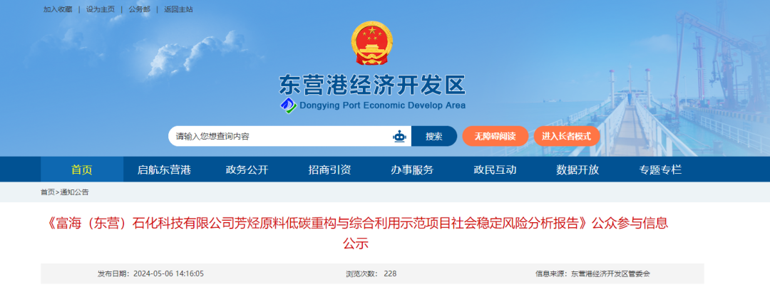 5月6日,富海(东营)石化科技有限公司”芳烃原料低碳重构与综合利用示范项目“社会稳定风险分析报告公众参与信息公示。