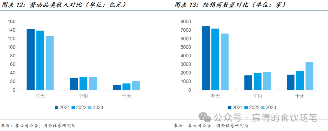酱油品类来看,三家企业均在Q1实现恢复,且成为收入增长驱动力。海天味业23Q4/24Q1分别实现总营收59.1/76.9亿元,同比变化-9%/+10%,其中酱油品类营收30.11/40.85亿元,同比+6.47%/+10.06%,酱油成为主要增长驱动力,且Q1恢复双位数增长主要系公司加强经销商库存控制,扩展工业客户及加强新零售渠道布局。