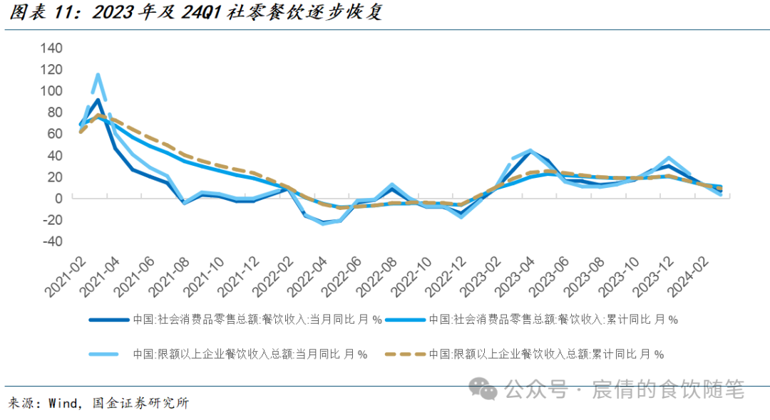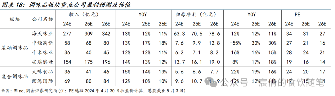 基础调味品:23Q4基础调味品龙头企业(海天/中炬/千禾/恒顺)收入均同比下滑,主要系春节错峰同期具备高基数,且23年海天、中炬等处于内部变革期,库存、人效明显优化,具体势能集中在Q1释放。海天/中炬/千禾24Q1收入恢复增长,分别同比+10%/+9%/+9%,较前期明显提速。我们认为主要系1)餐饮端持续修复,且近年来餐饮需求集中于旺季超预期释放,如1-2月全国餐饮社零收入同比+12.5%,3月略有回落至同比+6.9%。2)居民端去年同期处于去库存阶段,而今年库存恢复至正常区间,春节旺季亦具备补库存需求。3)企业内部变革成效逐步显现,23年海天、中炬收入集中承压,同比均下滑4%,主要系内部对经销商库存、企业治理等方面进行反思及改革,24Q1清理包袱再出发,调味品业务收入恢复双位数增长。