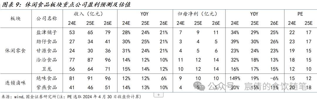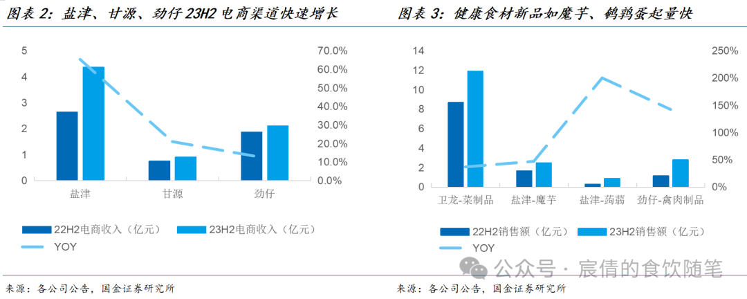 坚果、魔芋、蒟蒻、鹌鹑蛋逐渐成为热门细分赛道,其食材具备高蛋白、低卡路里、营养素丰富等特征,满足现代消费者的健康、减脂需求。分公司来看,盐津23H2休闲魔芋/蒟蒻/蛋类零食收入分别为2.5/0.9/2.2亿元,分别同比+47%/+196%/601%。甘源23H2综合果仁及豆果销量+22%,系藤椒腰果、冻干坚果等新品类上市。劲仔23H2禽肉制品收入2.8亿元,同比+143%,其中肉干维持稳健的双位数增长,鹌鹑蛋年销突破3亿。