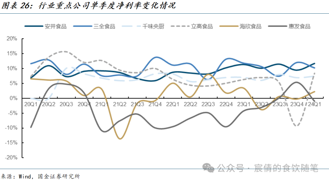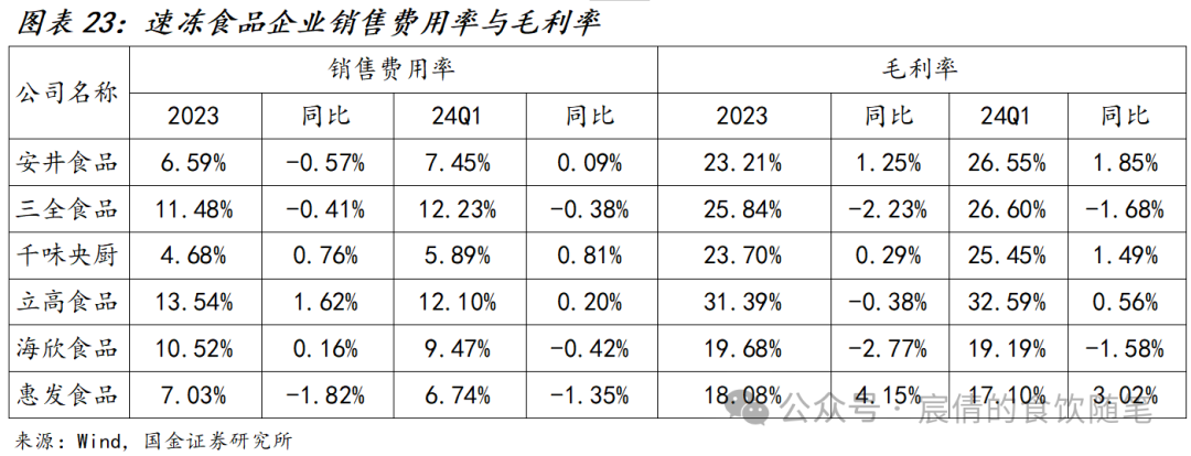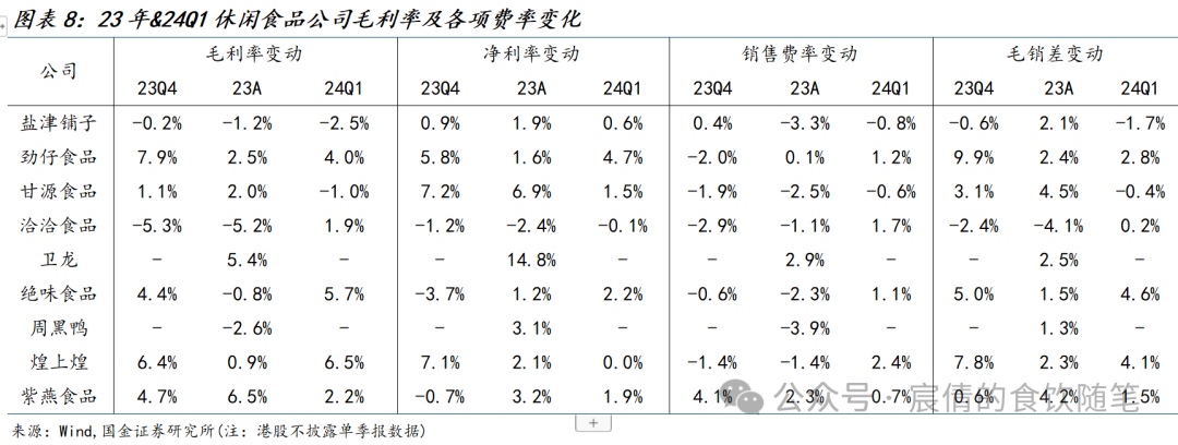 休闲零食:1)从成本端来看,受益于大宗商品如面粉、油脂等价格回落,行业内公司毛利率大多同比改善,其中卫龙毛利率增幅最明显(成本下行叠加提价),23年毛利率同比+5.4%,毛销差亦同比提升2.5pct。劲仔23Q4/24Q1毛利率同比+7.9%/+4.0%,系自鳀鱼干、鹌鹑蛋原料成本下降,叠加鹌鹑蛋起量规模效应释放。甘源23Q4/24Q1毛利率同比+1.1%/-1.0%,系Q1针对春节对电商等渠道进行促销活动,且棕榈油价格上涨致毛利率承压。盐津23A/24Q1毛利率分别同比-1.2%/-2.5%,主要系渠道结构变化,如零食量贩及电商渠道毛利率显著低于传统商超,但费投结构持续优化推动23年全年毛销差改善2.1pct。洽洽23Q4/23A毛利率分别同比-5.3%/-5.2%,主要系使用葵花籽高价库存,Q4新采购季葵花籽价格下降,24Q1毛利率同比改善1.9%。2)从费用端来看,23Q4大部分公司销售费率呈现下降趋势,洽洽/劲仔/甘源分别-2.9%/-2.0%/-1.9%,主因下游渠道结构变化,通过直接与零食专营店对接合作,减少了中间链节点,节约了如进场、条码、仓储、配送等费用。卫龙23年销售费率同比+2.9%,主要系前期提价20%叠加成本下行,毛利率提升空间较大,公司让渡部分利润进入下游渠道,招聘业代辅佐大经销商,进行渠道精细化建设,总的来看23年毛销差+2.5%。