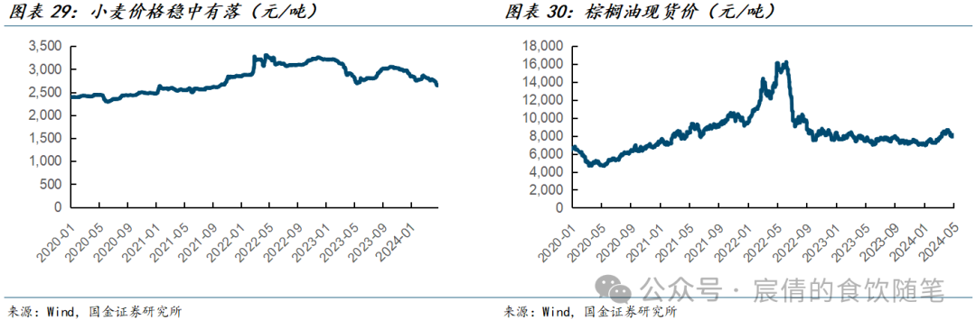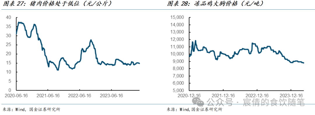 从原材料成本角度来看,预计面粉类产品价格稳中有落,油脂类产品价格在去年Q4回升后短期难以出现明显上涨,米面类制品成本预计较为宽松。从肉类原料来看,生猪产能已经连续15个月回落,预计下半年猪肉价格出现回升,而禽类产品或在猪肉带动下出现上涨,整体来看成本端较为平稳。