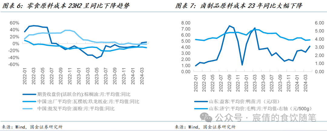 连锁卤味:1)从成本端来看,23年初鸭苗价格逐步回落,传导至出栏阶段,毛鸭价格在2023年7月出现环比下降。卤制品相关公司毛利率显著提升,弹性则取决于22年的采购成本基数,即锁价策略差异。如绝味23Q4/24Q1毛利率同比+4.4%/+5.7%;煌上煌23Q4/24Q1毛利率同比+6.4%/+6.5%;紫燕食品因牛肉、鸡肉等价格同步下降,23Q4/24Q1毛利率同比+4.7%/+2.2%。周黑鸭23年毛利率同比-2.6%,主要系其22年低位锁价原料,而23年初采购单价冲高,但销售费率下降带来毛销差改善,23年毛销差+1.3pct。2)从费用端来看,经历过22年行业利润低迷期,23全年主线为降本增效,绝味、周黑鸭和煌上煌销售费率23年同比-2.3%/-3.9%/-1.4%。最终净利率端同步改善,绝味、周黑鸭和煌上煌23年净利率同比+1.2%/+3.1%/+2.1%。且24Q1成本仍处于低位,毛利率延续恢复态势,绝味/煌上煌/紫燕24Q1毛利率分别同比+5.7%/+6.5%/+2.2%。
