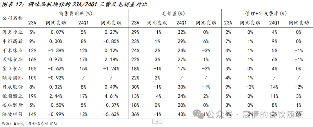 从费率角度看,基调行业前期需求+成本承压龙头持续精细管控费投策略,如减少非必要广告宣传支出,旺季加大终端建设费用投放,其中海天/中炬/千禾23年销售费率分别-0.1%/持平/-1.4%,毛销差实现稳健增长。复调企业前期成本压力较小,而需求持续增长,行业地域性品牌之间的价格竞争较为激烈,对应龙头销售费用投放较多,如天味食品24Q1销售费率同比+2.18%,主要系春节旺季促销搭赠活动增加所致。