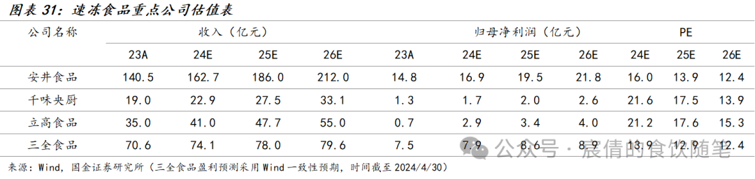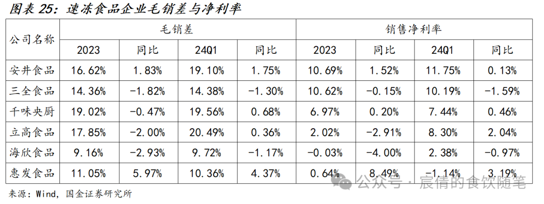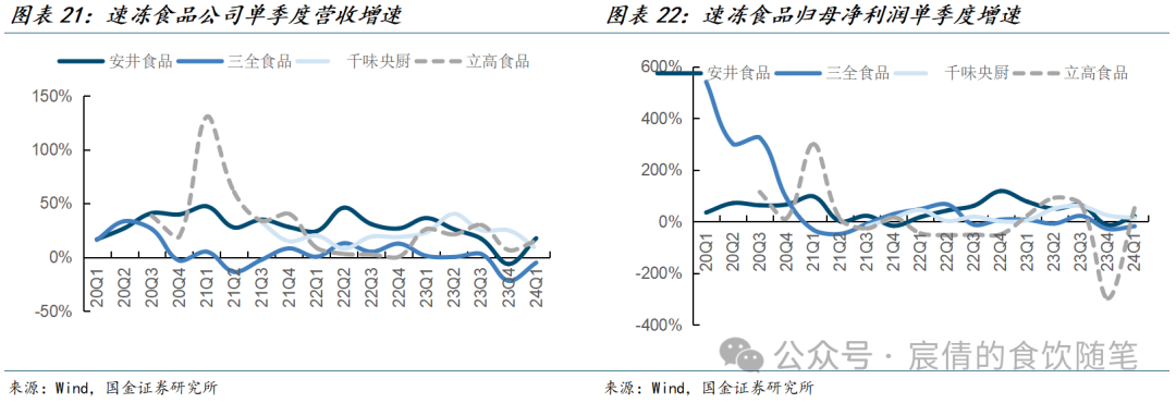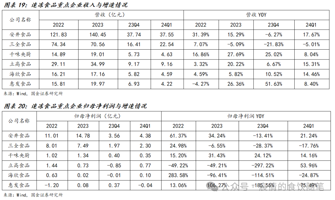 23年整体实现稳健经营,24Q1经营情况环比改善。从营收角度来看:2023年除三全食品受商超渠道与传统米面制品影响略有下滑外,其余速冻食品企业均实现稳健增长;除安井食品增速较2022年略有放缓外,其余企业2023年收入增速均有不同程度提升。分季度数据来看,受春节错期、销售产品结构、销售策略的影响,多数企业24Q1较23Q4环比增速出现改善,速冻食品企业一季度实现稳健增长。从利润角度看:2023年安井食品与千味央厨利润增速较为突出,惠发食品实现扭亏为盈,其余几家企业由于各种原因利润端出现下滑。分季度数据来看,23Q4行业整体承压较为严重,千味央厨利润增速低于全年平均水平,其余企业则出现不同程度的下滑,进入23Q1后行业整体情况出现好转。