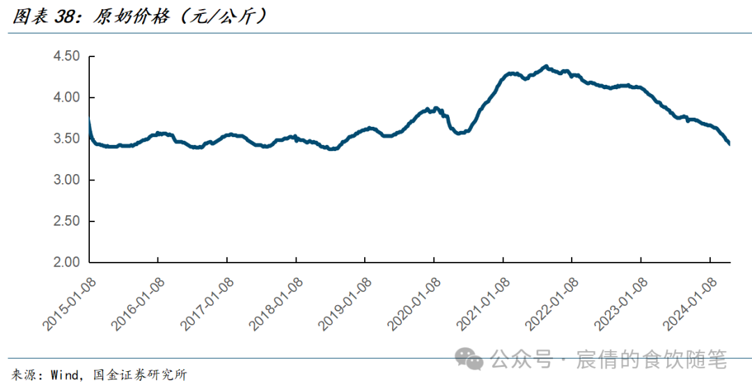 2021年中旬以来原奶价格处于下行通道,2023年受益于原奶价格持续下滑,乳制品企业盈利能力恢复性提升,根据农业农村部数据显示,截至2023年末奶牛存栏依旧处于高位,扩产周期下24年原奶价格有望进一步回落,目前原奶价格已经跌至近十年低位,乳制品企业成本红利有望进一步体现。