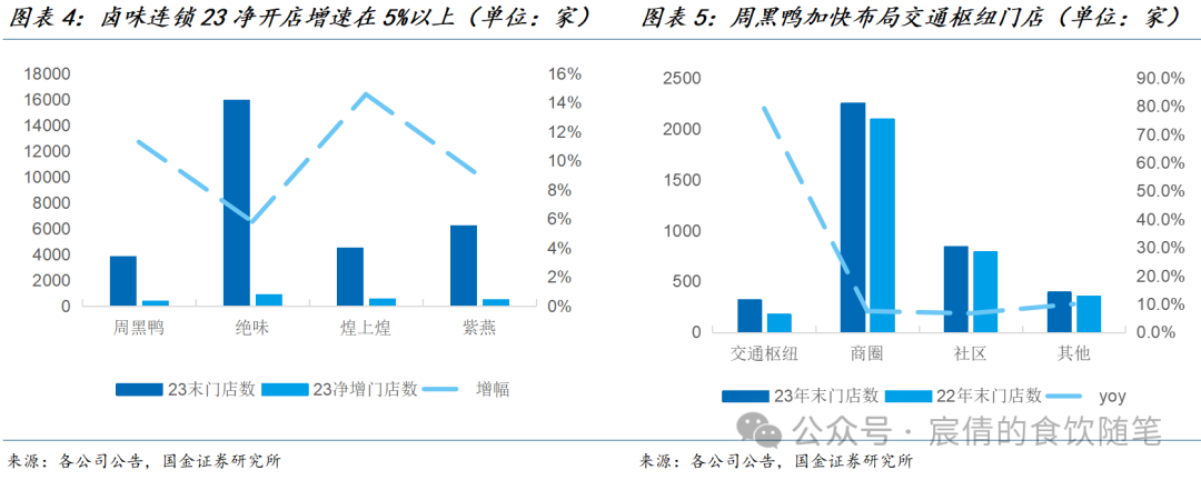 连锁卤味:消费场景打开,出行链加快修复。从各家23收入情况来看,周黑鸭/煌上煌/绝味/紫燕23年收入分别同比+17.08%/-1.70%/+9.64%/-1.46%。绝味和周黑鸭实现增长,而煌上煌和紫燕收入有所下滑。拆分开店数量来看,23年连锁卤味业态普遍加快开店节奏,周黑鸭/煌上煌/绝味/紫燕23年门店数量分别净增+387/+572/+874/+510家,绝味在高基数上仍然实现稳健扩张,龙头优势稳固。从门店类别看,因出行链人流修复,高势能门店布局速度更快,以周黑鸭披露数据为例,23年交通枢纽门店数增长约80%以上。