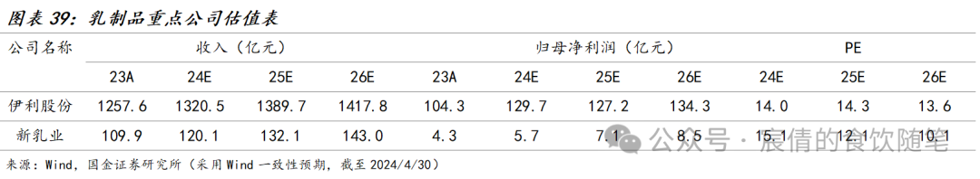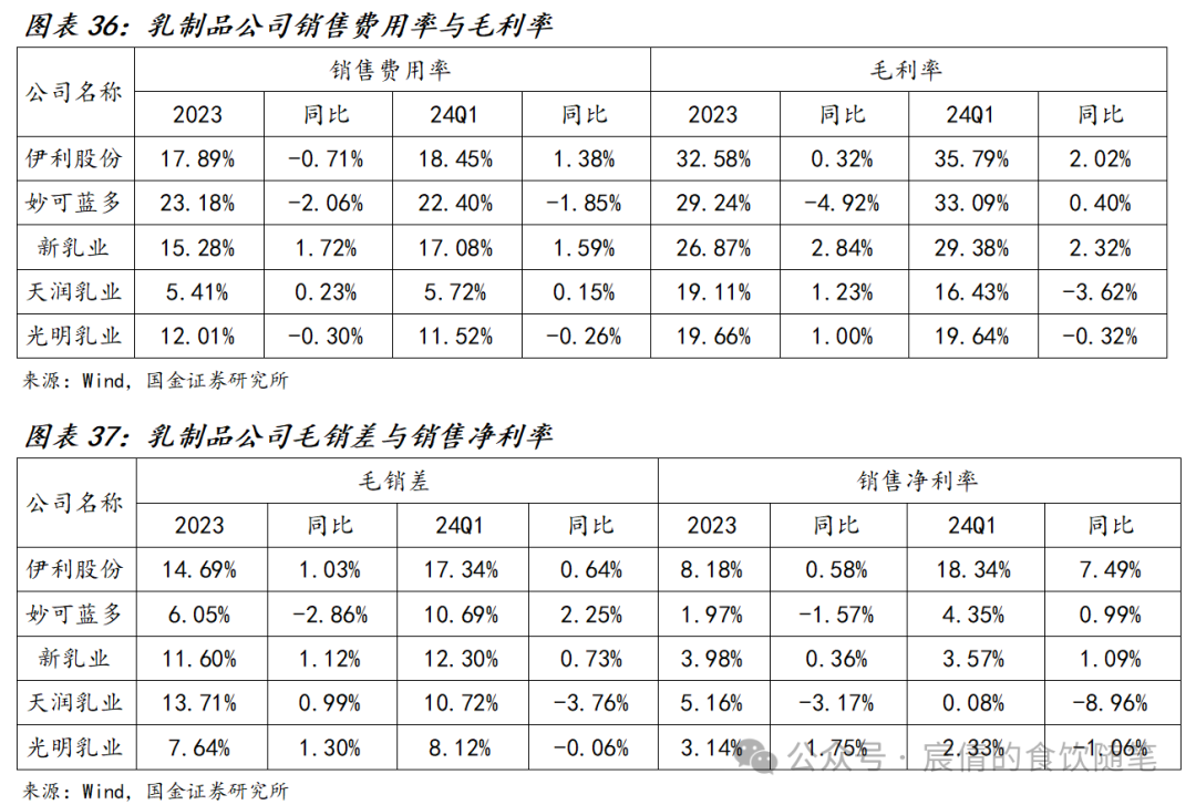 从费用和盈利能力角度看:原奶价格的下降持续改善行业整体成本,但是在竞争激烈的背景下,行业销售费用率投放略有提升,行业头部公司盈利能力稳中有升,利润增速优于收入增速,区域性企业则受销售战略和产品结构影响出现分化,其中伊利股份与新乳业毛利水平提升较多。从费用投放角度来看,2023年伊利股份、妙可蓝多费用投放较此前略有收缩,新乳业销售费用则有较大幅度提升;24Q1伊利股份与新乳业销售费用率较去年同期均有较大幅度提升,2024年预计伊利股份费用投放略有增加。