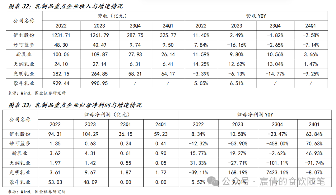 23年全年乳制品行业呈现弱复苏态势,由于消费场景打开后送礼需求的增加使得行业23Q1消费需求明显增加,随后行业需求端恢复较为缓慢,企业收入增长较为缓慢。液态奶:由于原奶供大于求叠加下游复苏偏弱,液态奶整体增长略有承压,从全年节奏来看,2023 年液奶需求呈现前高后低趋势,下半年景气回落导致行业库存有所增加,春节期间价格方面竞争较为激烈,目前整体趋势有所好转。奶粉:新生人口数量下滑致使婴幼儿奶粉市场竞争加剧,2024年新生人口数量预计环比好转,叠加政策驱动,预计头部企业奶粉有望实现稳健增长。奶酪产品:奶酪相比其他产品种类较为单一且价格较高,消费者需求复苏较缓慢,但长期来看市场容量空间足。预计2024年乳制品行业依旧处于弱复苏态势,行业竞争端预计较2023年略有好转,看好头部企业稳健增长下产品结构化升级带动利润率提升。