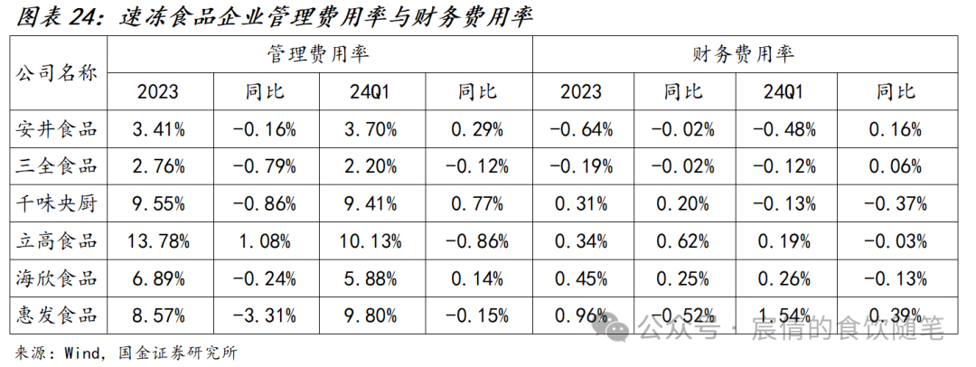 从费用和盈利能力角度看:2023年安井食品与惠发食品毛利率有较为明显的提升,三全食品与海欣食品则出现明显的下降,24Q1依旧维持此趋势。从销售费用率来看,2023年立高食品销售费用出现明显的提升,惠发食品销售费用明显下降,其他企业相对比较平稳;24Q1依旧维持此趋势,千味央厨整体销售费用率有所增加主要系开拓小B客户增加费用投放所致,整体来看行业费用投放相对比较克制,但是部分企业毛利与费用率的增加也说明行业竞争激烈程度有所增加。从管理费用率与财务费用率角度来看,除惠发食品财务费用率出现明显上升外,其余企业这两项费用相对平稳,立高食品管理费用率边际出现改善。反应到净利率来看,安井食品24Q1净利率水平出现新高,毛利率的提升拉动了整体利润表现;三全食品则受米面产品竞争出现毛利下滑,导致净利率水平较去年同期下降;立高食品则是受益于毛利提升与费用率的优化,带动整体净利润水平略有回升。