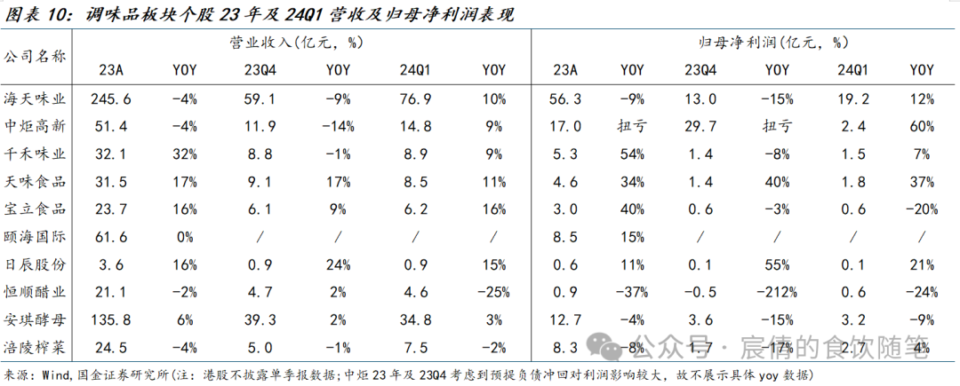基础调味品:23Q4基础调味品龙头企业(海天/中炬/千禾/恒顺)收入均同比下滑,主要系春节错峰同期具备高基数,且部分龙头处于内部变革期,针对经销商库存、组织架构等问题进行调整后,24Q1业绩具备边际改善。1)海天23年去库存&渠道改革效果逐步体现,Q1收入已顺利恢复双位数增长,且库存控制得当,全年业绩有望兑现。2)中炬Q1利润超预期兑现,新管理层到位后针对组织架构、人员数量、薪酬体系、供应链进行一系列调整和优化,重点指向毛利率偏低、管理费率偏高的问题,24年有望明显降本增效。3)千禾则需关注竞争加剧背景下,产品差异化打法及新经销商开拓对全国化的贡献。我们认为24年终端需求持续复苏叠加成本压力改善,更有利于龙头提升份额,建议关注内部治理改善后,业绩弹性释放空间较大的龙二中炬高新。