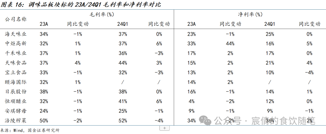成本端,23年核心原材料小麦、大豆价格同比下滑,白糖具备环比下降趋势。且从24Q1价格来看,基调成本压力持续缓解。从龙头企业业绩表现来看,24Q1海天、中炬毛利率同比均有改善,其中中炬受益于产品结构优化、原料成本下行,24Q1毛利率同比+6%;而千禾味业24Q1毛利率略有下滑,我们认为主要系春节加大促销力度、产品结构变化所致。