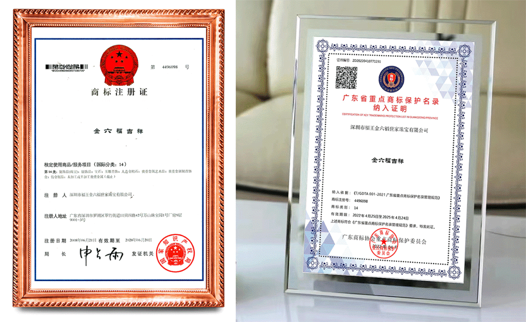 【金六福吉祥】属于综合类珠宝品牌,品牌商标在国家知识产权局注册成功,并于2022年纳入广东省重点商标保护名录。