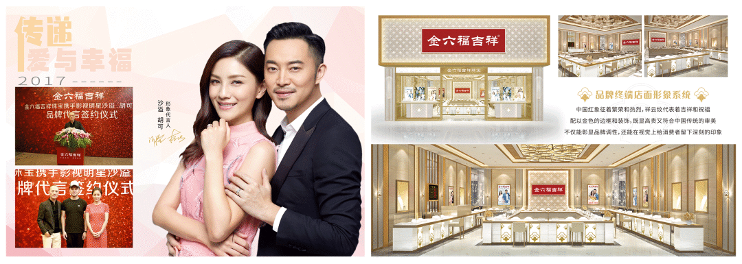金六福吉祥品牌,历经20多年的品牌经营沉淀,知名度、美誉度享誉全国。品牌以”打造吉祥珠宝国民品牌,传递爱与幸福”为使命;以“共筑中国金六福吉祥梦”为企业愿景;以“团结、拼搏、奉献、感恩、坚信、坚持、共享、共赢”为企业核心价值观;携手国内顶尖设计团队打造企业形象识别系统;终端门店形象使用祥云纹元素配以中国红和金色强调品牌形象,在视觉上留下深刻印象;签约国际影视巨星沙溢、胡可夫妇为品牌倾情代言,幸福明星代言让品牌知名度、美誉度更加温馨有爱。