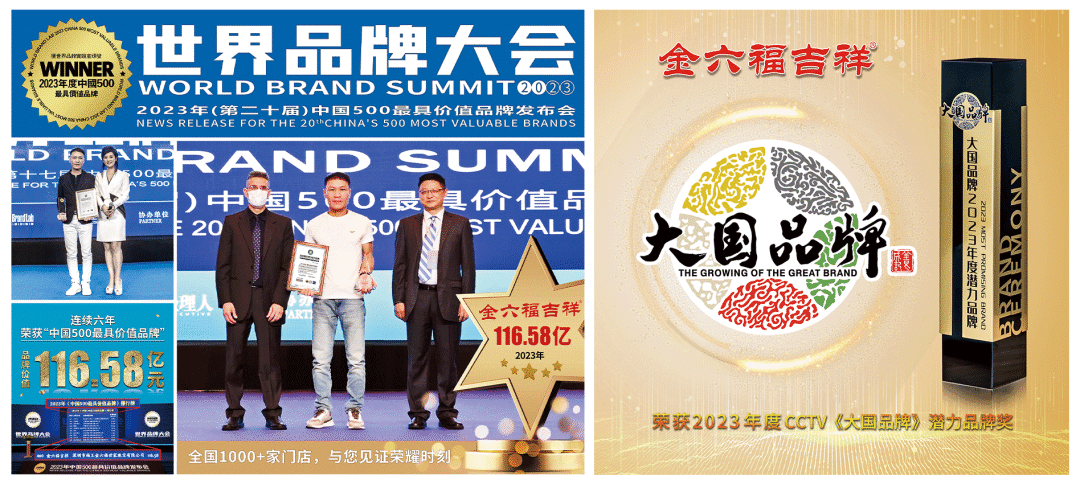 同时,金六福吉祥作为中国珠宝玉石首饰行业协会理事单位、中国质量检验协会会员单位、广东连锁经营协会会员单位、深圳市黄金珠宝首饰行业协会理事单位、广东商业特许经营百企、百度信誉官方认证企业;被评为”广东省百强诚信企业”、”广东省守合同重信用企业”、"中国消费者满意产品”、”广东十大特许经营品牌”,连续六年荣获”中国500最具价值品牌(品牌价值116.58亿元)“、荣获《大国品牌2023年度潜力品牌》等众多奖项。截至目前,金六福吉祥各项荣誉、认证多达百余项,为终端门店提供坚实的品牌支持。