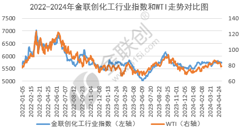 如上图所示,据金联创化工行业指数监测,5月初化工市场和国际原油走势延续分化走势。五一期间,国际原油持续承压收跌,WTI从80美元/桶上方迅速跌落至78美元/桶左右;但同期化工行业指数表现较原油抗跌,节前后依然围绕5750上下波动。