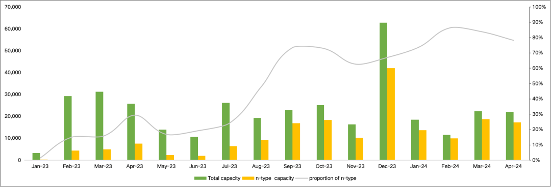 2024年1-4月光伏组件招标量约74.65GW;其中N型组件招标占比已达8成;2024年1-4月N型组件招标约59.8GW,占比80.1%;4月明确N型组件招标量达17.3GW,占比达78.3%。HJT组件继续发力,4月招标量破GW。据不完全统计,2024年以来光伏组件招标中明确HJT招标项目约3.34GW,需求有望加速释放。