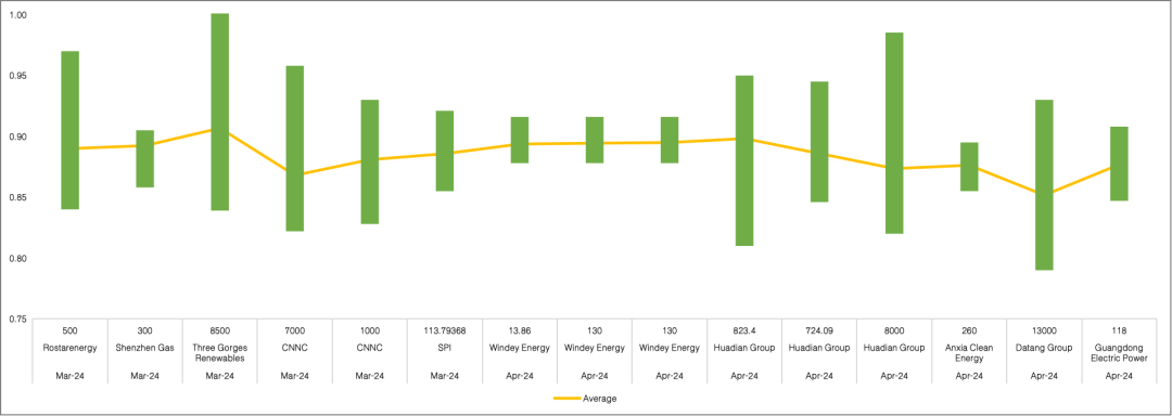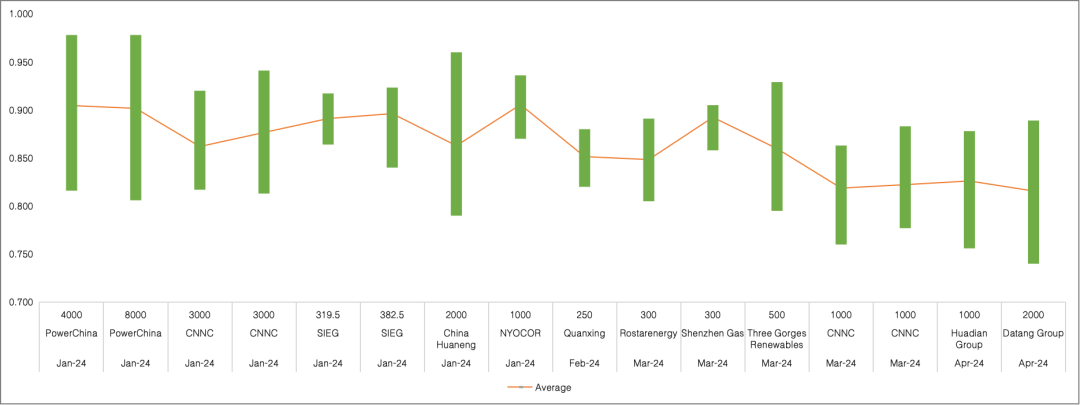 4月共有约23.2GW N型TOPCon组件集采开标,投标价格在0.79-0.985元/W之间,投标均价为0.876元/W,与3月均价相比下滑1-2分/W。值得注意的是,在4月大唐集团2024-2025年度13GW N型TOPCon组件集中采购中,共49家企业参与,投标单价0.79-0.93元/W,平均为0.852元/W,这是首次有企业在央国企组件招标中报出TOPCon组件含税运0.8元/W以下价格。