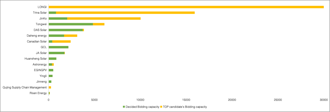 从组件中标结果(包含入围)来看:2024年1-4月已公布中标结果及中标候选人的规模达111.2GW,含已定标规模52.8GW,第一中标候选人规模58.4GW;在组件中标结果中(含定标及第一候选人中标),晶澳、晶科、隆基、天合四家一线企业中标规模达57.7GW,占比达52%;新一线企业(通威、一道新能源、阿特斯、东方日升、协鑫集成、环晟光伏、正泰新能、亿晶光电、英利能源)中标规模达16.97GW,占比15.26%。