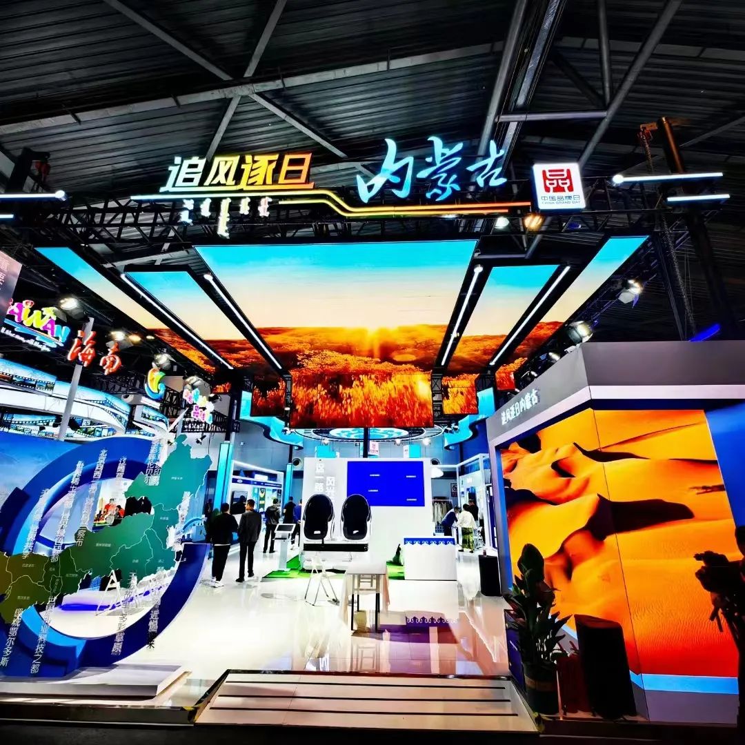 本届中国品牌日内蒙古馆以“追风逐日 内蒙古”为主题。顶部设计数字折屏,在轮播内蒙风光中,展现内蒙古拥抱绿色智能新时代,建立一个个“风光蓝海”的美好景象。