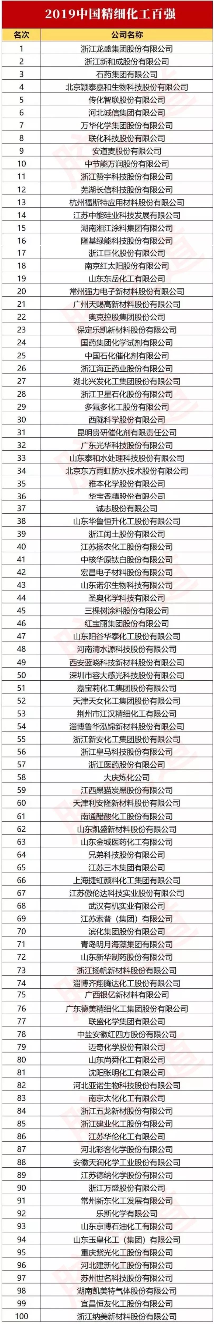 2019年11月28日,在由全国精细化工原料及中间体行业协作组、中国化工情报信息协会在广西北海联合主办,中国化工信息中心承办,北海市铁山港区人民政府、北海市铁山港(临海)工业区管理委员会协办的“第十九届国际精细化工原料及中间体(铁山港)峰会暨2019中国精细化工百强发布会”上,公布了“2019中国精细化工百强”榜单。
