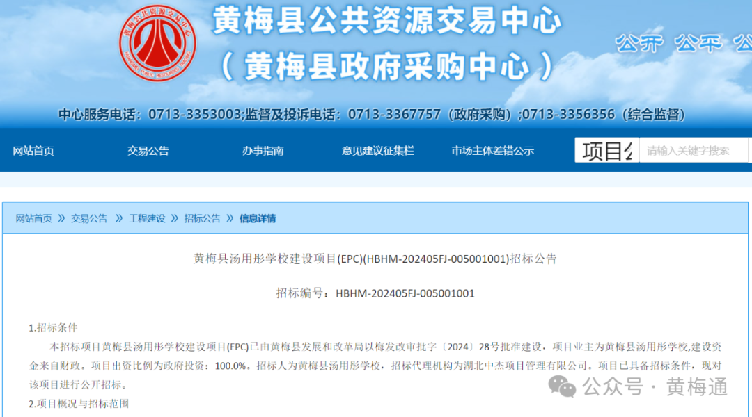 黄梅县汤用彤学校建设项目(EPC)(HBHM-202405FJ-005001001)招标公告