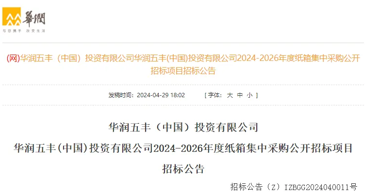 近日,《华润五丰(中国)投资有限公司2024-2026年度纸箱集中采购公开采购项目招标公告》公布。本次招标项目涉及6个业务单位、9处厂区/基地,共分10个标段,纸箱需求量大,有意向的企业可于5月11日前获取招标文件。