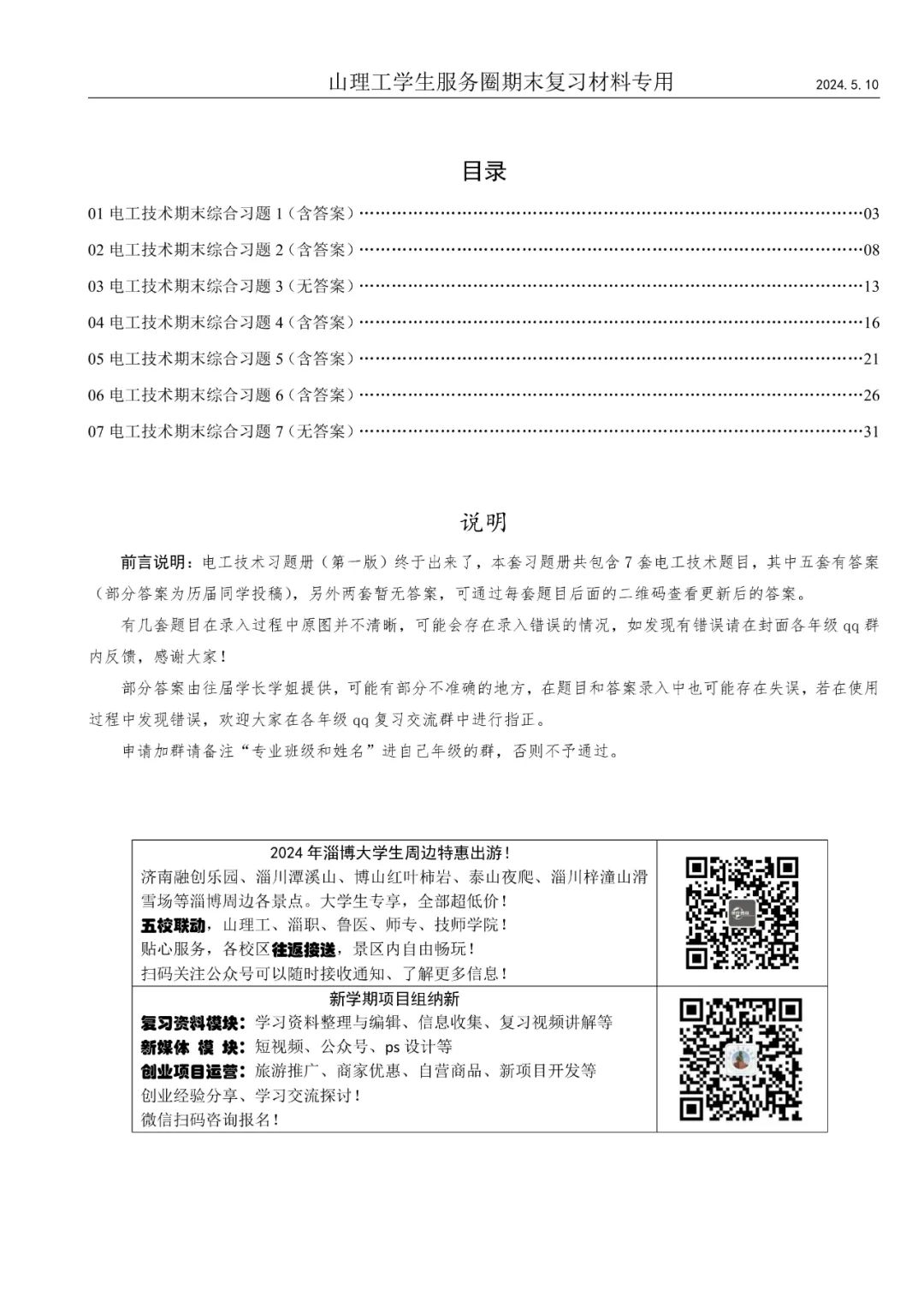 版本:2024年第一版(今天试打印,预计明天周日正式上架)内容:七套综合习题以及答案(五套有答案;两套无答案,更新后可通过每一套后面的二维码查看答案)。团购:需要班级团购的可以微信联系小叔,优先供用,免费配送!自提:西校区东门内大红炉二楼楼梯口处,8:00-23:00均可自取,自取请在桌子上填写订单信息表!配送:西校区配送费1.5元/单,周一至周五每天集中配送;东校区3元/单,每周二周四集中配送!
