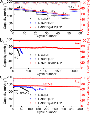 图5. (a) Li-NCNF@MoP||LFP、Li-NCNF||LFP和Li-Cu||LFP全电池的倍率性能。(b) Li-NCNF@MoP||LFP、Li-NCNF||LFP和Li-Cu||LFP全电池在5C下的长循环。(c) Li-NCNF@MoP||LFP、Li-NCNF||LFP和Li-Cu||LFP全电池在1C低N/P比的条件下的循环性能。