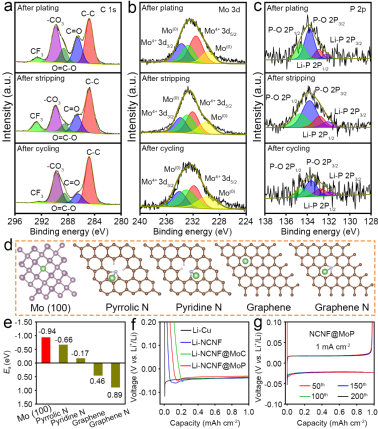 图2. (a) C 1s,(b) Mo 3d和(C) P 2p的XPS谱图。(d) 密度泛函理论(DFT)计算中Mo(100)、吡咯N、吡啶N、石墨烯和石墨烯N的模型。(e) 不同种类锂原子的Ea计算结果总结。(f) 电流密度为1 mA cm−2初始镀锂时不同载体的电压分布图。(g) NCNF@MoP载体在不同循环下镀/剥离锂的电压分布图。