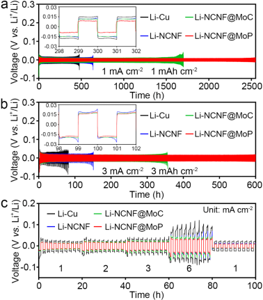 金属锂由于其理论比容量高、氧化还原电位低,是锂离子电池极具潜力的负极材料。然而,在电镀/剥离过程中,枝晶的不可控生长和巨大的体积膨胀严重阻碍了金属锂的实际应用。作者通过建构一种MoP纳米片修饰N掺杂碳纳米纤维(NCNF@MoP)作为潜在载体用于解决上述挑战。在固体电解质界面相形成过程中,MoP纳米片可以转化为具有高亲锂性的金属Mo物种和具有高离子电导率的Li3P相,同时整个载体转化为离子/电子混合导电网络,用于降低成核过电位,加速电极/电解质界面的扩散动力学。