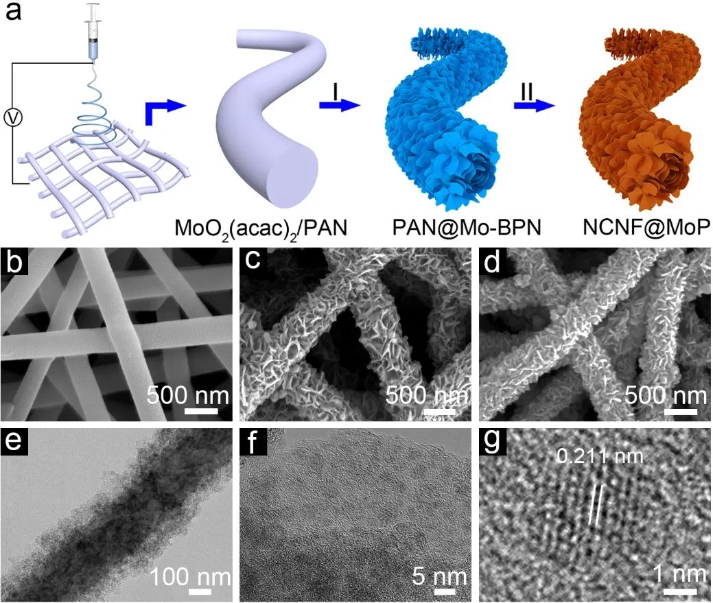 图1. (a) NCNF@MoP的合成示意图。Ⅰ) MoO2(acac)2与盐酸多巴胺的化学反应。II)表面处理和磷化工艺。(b) MoO2(acac)2/PAN,(c) PAN@Mo-BPN和(d) NCNF@MoP的FESEM图。(e) NCNF@MoP的TEM图像。(f,g) HRTEM和单个MoP纳米片的放大图像。