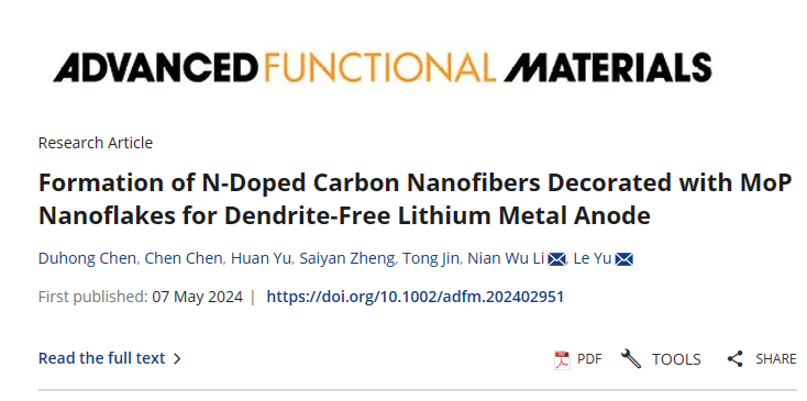 当使用NCNF@MoP载体组装的对称细胞在电流密度为1 mA cm−2的条件下呈现出10 mV的成核过电位,且能够长期循环2500 h。此外,Li-NCNF@MoP||LiFePO4全电池在5C (1C = 169 mA g-1)的高电流密度下,在经过2200次循环后仍保持了92.6%的较高容量。该成果以题为“Formation of N-Doped Carbon Nanofibers Decorated with MoP Nanoflakes for Dendrite-Free Lithium Metal Anode”在国际知名期刊Advanced Functional Materials上发表,本文第一作者为北京化工大学硕士生陈笃鸿和博士生陈晨,通讯作者为北京化工大学于乐教授和李念武副教授,通讯单位为北京化工大学。