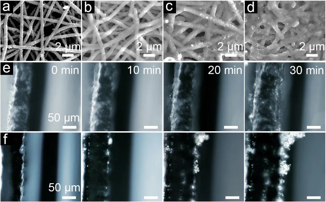 图3. (a) 初始NCNF@MoP载体,及沉积容量为(b) 4mAh cm−2,(c) 8mAh cm−2,(d) 12mAh cm−2后载体的FEESM图像。(e) NCNF@MoP载体和(f) NCNF载体在5 mA cm−2电流密度下不同时间的金属锂沉积过程的原位光学图。