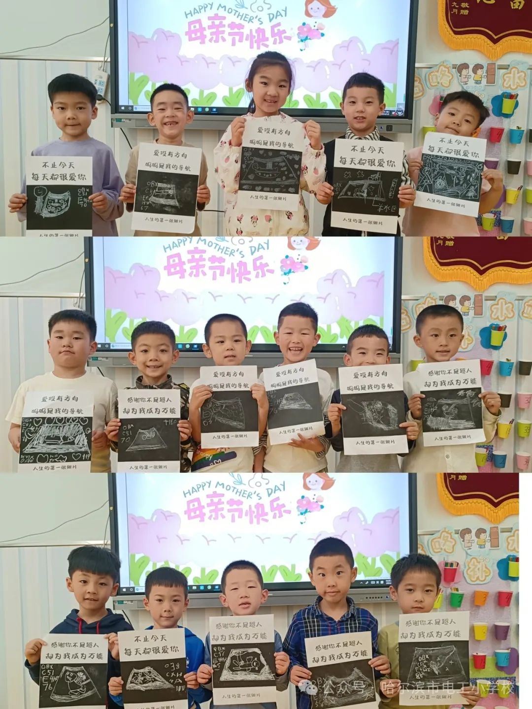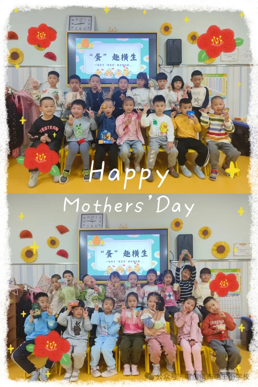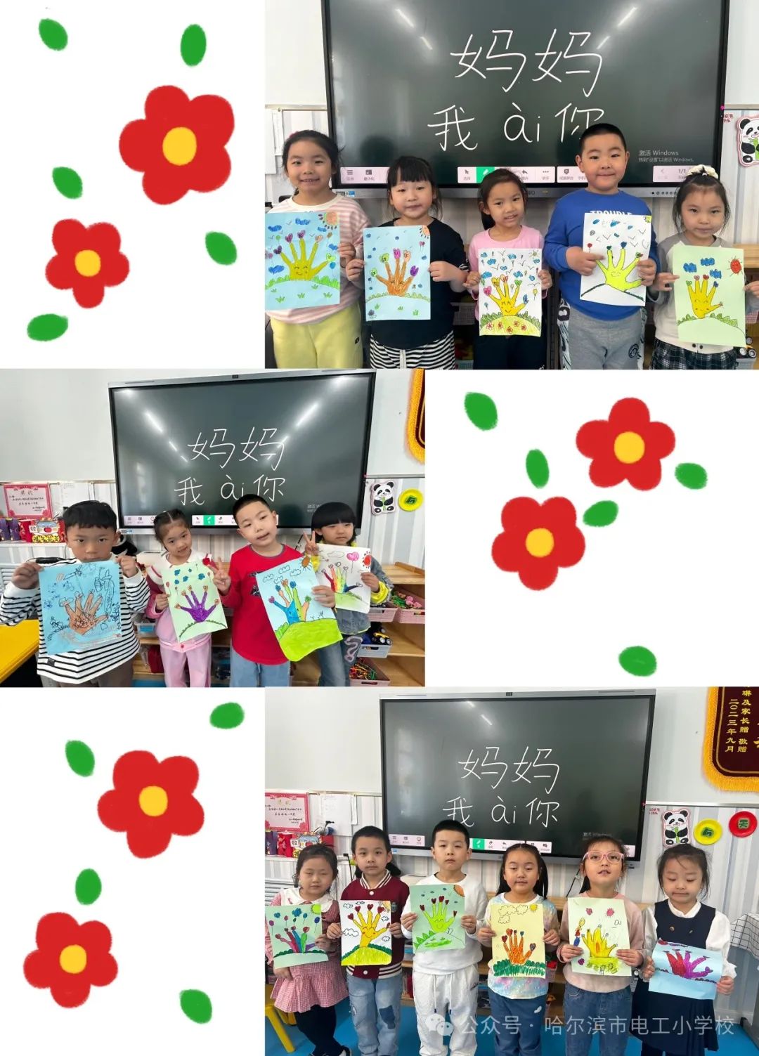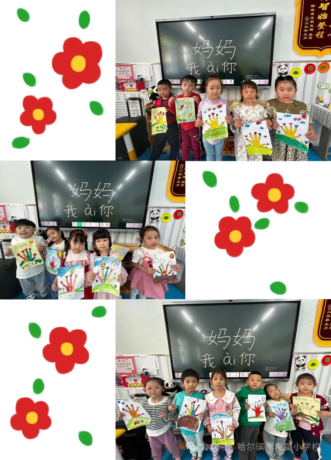 一张张缤纷的画作、一朵朵毛茸茸的小花、一块块五彩的黏土,都承载着电工宝贝们满满的心意。礼物虽小,爱很大,让宝贝儿们.用简单的方式来表达对妈妈的爱,用他们自己亲手制作的礼物,表示对妈妈的爱。