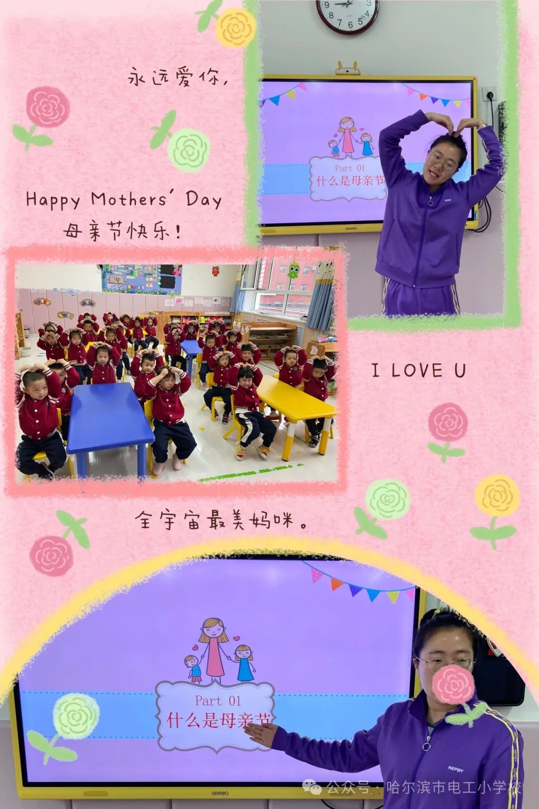 母爱如同大地,承载着我们成长的每一个脚步。在本次母亲节主题活动中,电工宝贝们用纯真的眼睛去发现、用稚嫩的心去感受,真切地体会到了在日常生活中妈妈对自己的照顾和关爱。孩子们也学着用力所能及的方式去表达爱、回报爱,从被爱到学会关爱。