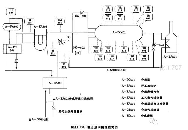 将合成氨装置内温度、压力与物料流量、冷却系统形成联锁关系;将压缩机温度、压力、入口分离器液位与供电系统形成联锁关系;紧急停车系统。 合成单元自动控制还需要设置以下几个控制回路: ⑴氨分、冷交液位;⑵废锅液位;⑶循环量控制;⑷废锅蒸汽流量;⑸废锅蒸汽压力。 安全设施,包括安全阀、爆破片、紧急放空阀、液位计、单向阀及紧急切断装置等。 | |||