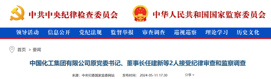 中央纪委国家监委网站5月11日消息,据中央纪委国家监委驻国务院国资委纪检监察组、浙江省纪委监委消息:中国化工集团有限公司原党委书记、董事长任建新,原党委副书记、总经理杨兴强涉嫌严重违纪违法,目前正接受中央纪委国家监委驻国务院国资委纪检监察组和浙江省监委纪律审查和监察调查。
