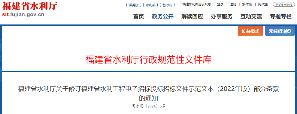 近日,福建省水利厅印发《福建省水利厅关于修订福建省水利工程电子招标投标招标文件示范文本(2022年版)部分条款的通知》(闽水规〔2024〕5号)(以下简称《通知》),暂停福建省水利工程电子招标文件示范文本中关于信用分的应用。