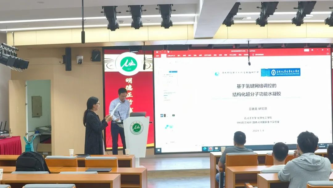 首先,周娜教授对王晓龙研究员的来访交流表示热烈的欢迎,并向现场师生介绍了王晓龙研究员在人工合成的超分子水凝胶研究方面所取得的成就。