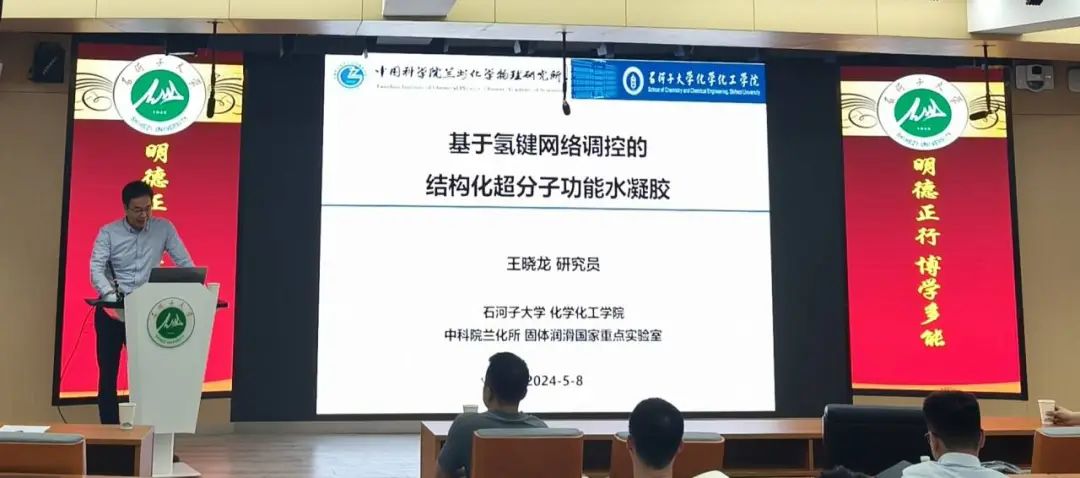 2024年5月8日18:00,石河子大学“化工大讲堂”2024年第十九讲在科技楼一楼明德学术报告厅顺利举办。中科院兰州化学物理研究所,研究员,山东省“泰山学者”特聘专家,石河子大学“绿洲学者”王晓龙,应邀为石河子大学化学化工学院师生带来了题为“基于氢键网络调控的超分子功能水凝胶”的学术报告。本次学术报告活动由石河子大学化学化工学院、化工绿色过程兵团重点实验室主办,化学化工学院周娜教授主持,化学化工学院23级、22级、21级农业化学品及功能材料工程课题组的硕博士研究生及感兴趣的同学参加。