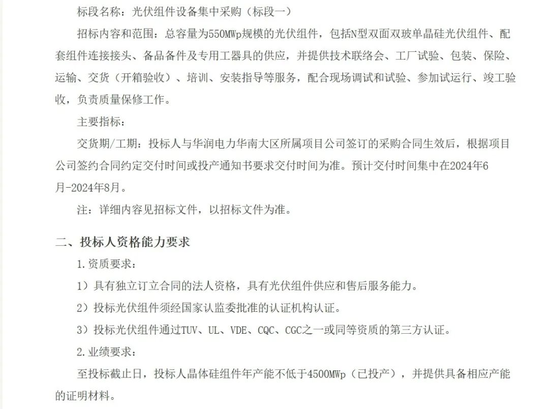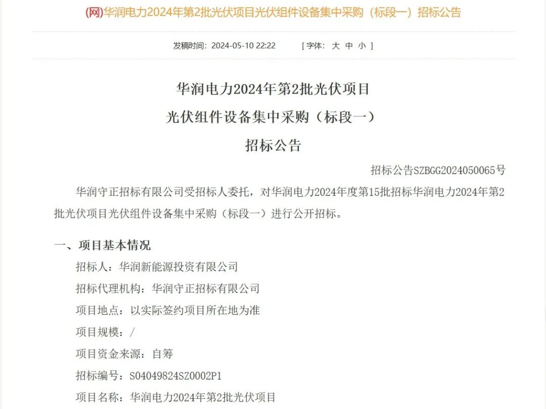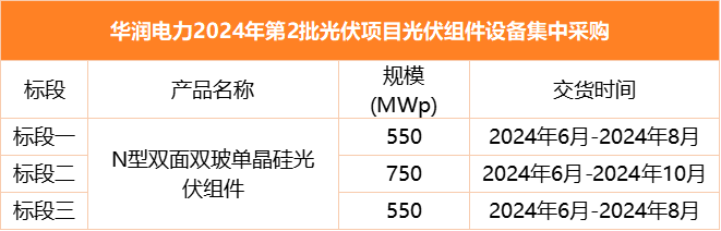 5月10日,华润电力启动2024年第2批光伏项目光伏组件设备集中采购招标,本次招标分为三个标段,共采购N型光伏组件1.85GW,2024年5月31日9:00开标。