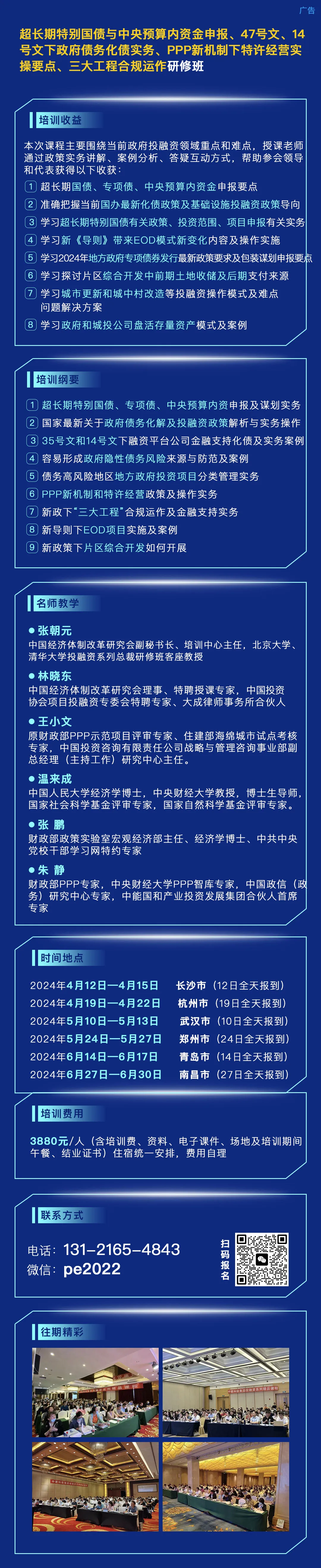 超长期特别国债与中央预算内资金申报、47号文、14号文下政府债务化债实务、PPP新机制下特许经营实操要点、三大工程合规运作研修班