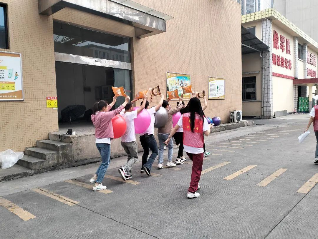 双手举起小酥肉充气外袋,6位队员5个球,大家齐步向前走,比的是同步,赛的是协调。趣味背夹球项目6人一组,自由组队,共20组参赛。准备好了吗?出发!