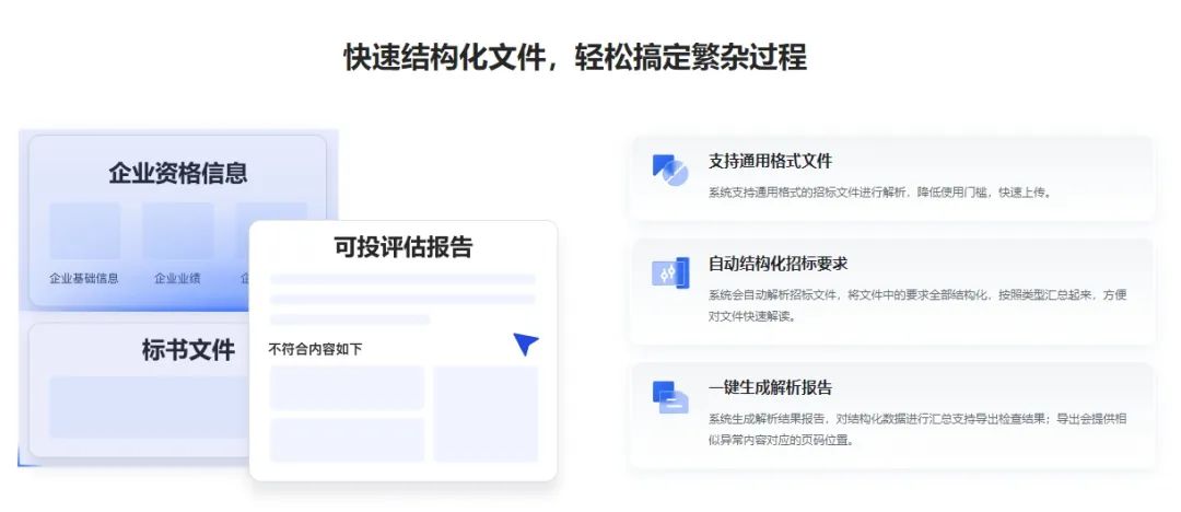 通过AI计算能力对招标文件进行全面智能解析,重点标记废标项等关键信息,通过结构化节点的处理,建立快速阅读招标文件的导航,将结构化内容与招标文件智能关联起来。以下是一些核心功能: