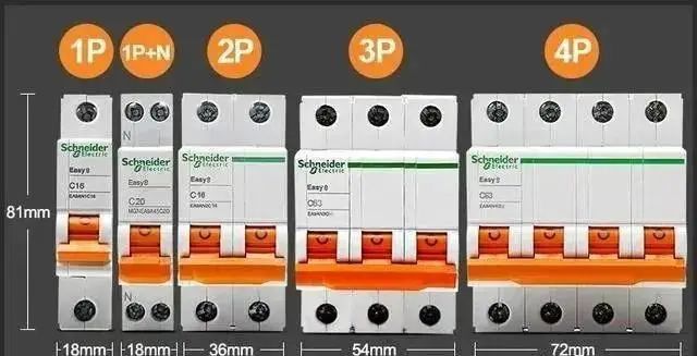 其实除了1P、2P之外,还有3P、4P等。如果我们对于空开了解不多,我们可以从它们的宽度上进行区别,一般每1P的宽度是递增的,1P空开的宽度是18毫米,那么相应2P空开的宽度就是36毫米,3P、4P依次递增!